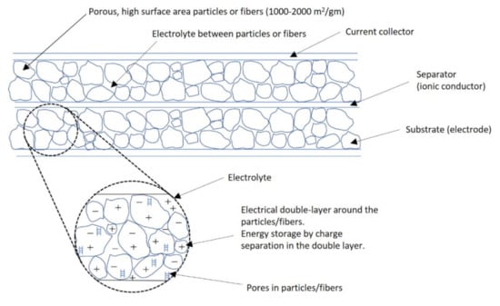 Electrochemical capacitors (ECC) are devices that store electrical energy [] by capacitive (charge separation) mechanisms and require electrochemical phenomena to function. As shown in Figure 1, the charge is stored in the nanopores of a microporous material that form the electrodes of the device. The construction of the electrochemical capacitor is similar to that of a battery, but they use different materials in the electrodes.