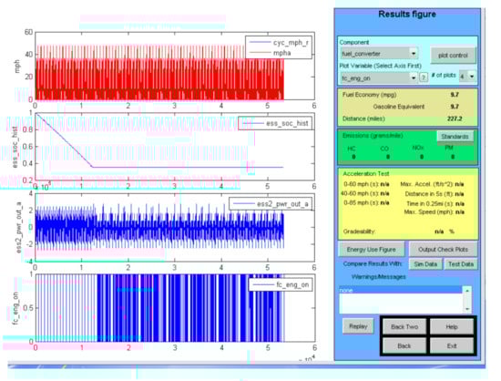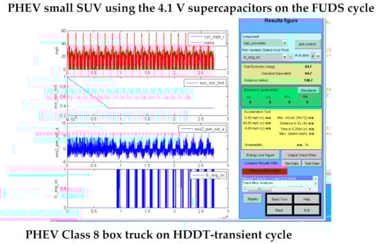 Advisor simulations were also run for PHEVs using supercapacitors. The PHEVs operate as an EV until the main storage battery is depleted, and as an HEV for further driving. The PHEVs simulated were set up with a supercapacitor to assist the main storage battery during periods of high power demand, and then to operate independently of the battery in the HEV mode. Hence the PHEV fuel economy in the HEV mode would be essentially that shown in Table 8 for each type of vehicle. The use of the supercapacitor to assist the main storage battery will permit it to be optimized for energy density rather than power. As shown in [,], this will reduce the size and cost of the main battery and extend its cycle life. Advisor output graphics of PHEVs operating in the EV and HEV modes are shown in Figure 5 for a small SUV and a Class 8 box truck.