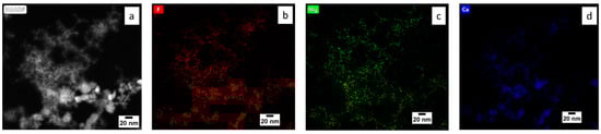 The Figure 1a presents the high-angle annular dark field scanning transmission electron microscopy (HAADF-STEM) image of nanoparticles of MgF2 and CaF2 synthesized in one sol and the corresponding energy dispersive spectroscopy map (Figure 1b–d). From Figure 1a, it is seen that particle sizes are less than 20 nm. The small size of these low-water soluble metal fluorides enables them to be distributed inside wood during treatment. Additionally, elemental mapping presented in Figure 1b–d confirmed that both MgF2 and CaF2 particles are present in the sol with the latter forming larger aggregates.