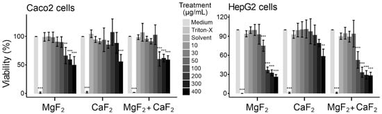Cell viability was only impaired in concentrations of 200 µg/mL and 100 µg/mL and above for Caco-2 cells and HepG2 cells, respectively (Figure 2). It is observed that HepG2 cells are more sensitive to both nanoparticles. Nevertheless, both in-vitro cell models show low impact of the nanoparticles on cell viability and the concentrations causing cytotoxicity are considered high also in other toxicological studies with nanomaterials []. These results are similar to MTT assays done with MgF2 nanoparticles on human embryonic kidney cells which were reported to have no adverse effect on them [].