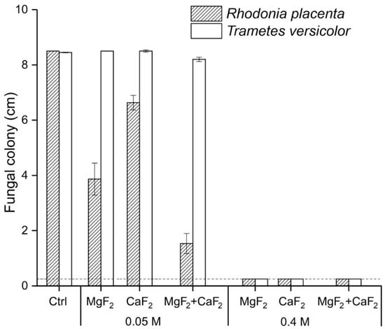 The biocidal efficacy of combination of MgF2 and CaF2 against R. placenta and T. versicolor was demonstrated with an in-vitro agar test. In comparison Cu-amine was reported to have limited protection against T. versicolor in an in-vitro agar test []. Thus, the combination of nano metal fluorides is more biocidal compared to Cu-amine against T. versicolor.