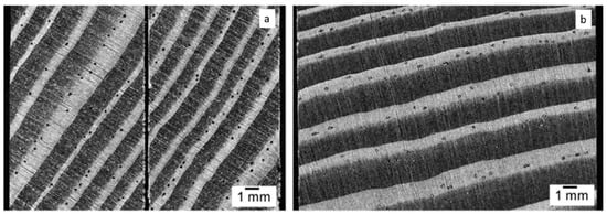 X-ray micro-CT images of the transverse section of Scots pine wood treated with NMFs: (a) before leaching; (b) after leaching.