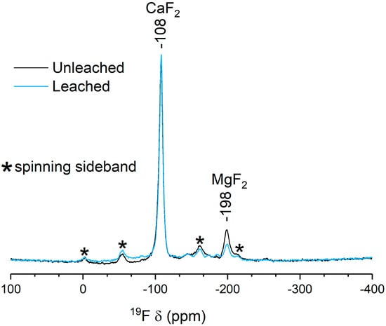 The 19F MAS NMR spectra of Scots pine sapwood treated with combination of MgF2 and CaF2 (unleached and leached) are depicted in Figure 5. Both unleached and leached treated wood show signals that can be attributed to MgF2 with a chemical shift of −198 ppm and CaF2 with a chemical shift of -−108 ppm. The remaining signals in the spectra are spinning sidebands. The intensity of the signal attributed to MgF2 is lower in the leached treated wood than unleached treated wood. This is possibly due to the higher solubility of MgF2 (130 mg/L) compared to CaF2 (16 mg/L) []. Therefore, the accelerated ageing test causes more of MgF2 to be leached from treated wood than CaF2. Even though NMFs are leached from wood, it is important that a sufficient amount remains to be biocidal to fungi.