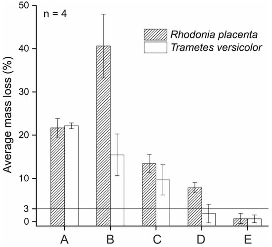 Average mass loss caused by R. placenta and T. versicolor. A—Ethylene glycol, B—NaF (1 M), C—MgF2 (0.5 M), D—MgF2 (0.8 M), E—MgF2 + CaF2 (0.5 M). The horizontal line is the mass loss cut-off at 3% for durability classification.