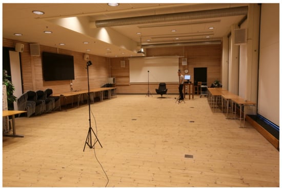 The room in which the measurements took place is a multi-purpose lecture hall of size 17.7 m × 8.7 m with a 3.9 m ceiling (see Figure 1). The ceiling is located 0.4 m below the concrete floor from the second storey of the three storey building. This multi-purpose lecture hall is equipped with easily removable furniture, a feature which is suitable for conducting experimental VR studies due to its open and obstacle-free space.