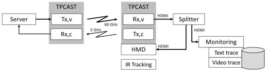 Figure 3 and Figure 4, respectively, show a block diagram and photos of the typical placement of the hardware components of the TPCAST wireless VR testbed. In the following, detailed descriptions of the different blocks of our TPCAST VR testbed that were used in this work are provided. The interested reader is referred to [] for further details of the TPCAST VR testbed and its complete monitoring capabilities that may be used to pursue experimental studies on other challenges of wireless VR.