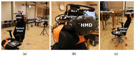 A floor plan of the multi-purpose lecture hall is shown in Figure 2. The walls consist of different materials including wooden walls, glass windows with blinds, wooden doors with small windows, a whiteboard, and a multi-screen arrangement. Further, a few items of furniture and information and communication technology (ICT) equipment were in the room during the measurement campaign. The distance between the transmitter Tx,v and the receiver Rx,v (receiving HMD on the full-swivel chair) was chosen as m. The location of the receiver Rx,v remained fixed while the transmitter Tx,v was moved to the different locations within the multi-purpose lecture hall at the specified distances. It is noted that the distance m extends the transmitter placement from the wide open room into the narrow corridor-like appendix seen on the right-hand side of the floor plan. Two SteamVR base stations (infrared (IR) tracking) were used for room-scale tracking of the locations of the HMD and controller locations. The computer table in the vicinity of the receiving HMD on the full-swivel chair holds the equipment for recording the video stream traces.