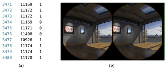 Example traces produced by the monitoring: (a) Excerpt of the text trace obtained for a transmitter-receiver distance of m and initial HMD direction (first column: frame number; second column: measured inter-frame time in micro-seconds ( relating to a nominal frame rate of 89.53 fps); third column: flow indicator (0 = freeze, 1 = no freeze), (b) Video trace sample of “SteamVR home screen” [] given as screenshot of the first frozen frame, here frame number 3474 with HMD residing in Q3.