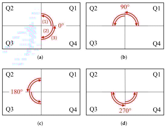 Definition of full-swivel chair rotational movement pattern in terms of initial azimuthal angle and covered quadrants: (a) covering Q1 and Q4, (b) covering Q2 and Q1, (c) covering Q3 and Q2, (d) covering Q4 and Q3.