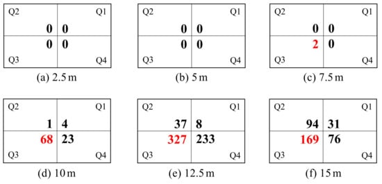 Number of freezes detected in the four quadrants for different distances between transmitter and receiver.
