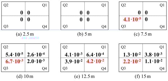 where denotes the freeze intensity in the i-th quadrant. The highest freeze intensities were observed in Q3 and Q4 for 7.5 m, 10 m, and 15 m and tightly followed by Q3 for 12.5 m. Similar as for the number of freezes, reasons for the observed freeze intensities may be related to the wall materials and room topology. An alternative representation of the number of freezes and freeze intensities subject to the initial azimuthal angle is provided in Appendix A.