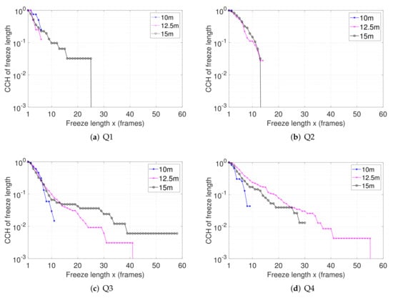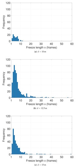The histograms of freeze length shown in Figure 9a–c indicate a few short freezes. The minimum freeze length of , i.e., two subsequent video frames are identical, is observed for the cases of m and 15 m while is the minimum freeze length for m. On the other extreme of large freeze lengths, these are obtained as for m and for m. Given the minimum freeze length of , the histograms are right-skewed with the respective distributions leaning to the left and the tails being drawn out to the right.