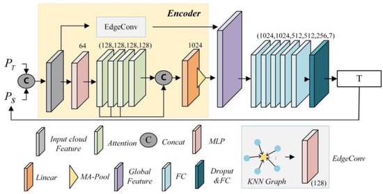 As shown in Figure 1, the encoder partially extracts local and global features. The concatenation operation integrates the two features into a global feature vector  Since  contains geometric and direction information of the source and template point clouds, the transformation information can be extracted from the global feature vector through a series of operations expressed as