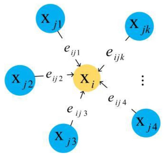 We establish the KNN topology as shown in Figure 2. The graph  represents a point  and its  neighboring points , where , , and . As a directed graph of the local point cloud structure, we define the edge feature as , where  is a nonlinear function with learning parameter  and  is the number of dimensions of the edge features. The K edge features are aggregated into  (i.e., accumulation or maximization) to obtain the output  corresponding to , which is defined as Formula (1).