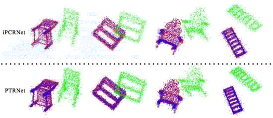 The results for point cloud registration in the noise-free categories are shown in Table 1. PTRNet had the better registration results than either the depth or of traditional methods. It is worth noting that the iPCRNET model does not contain the Transformer module and the local feature extraction method adopted by us. As mentioned in Section 3, the ablation experiment Model-V2 adopts the same Transformer module as PTRNET but does not contain local features. Model-V1 contains local features but uses transformer modules that replace offset-Attention with self-Attention. For all performance indicators, the point cloud registration effect of models Model-V2 and Model-V1 with only local features or traditional Transformer is better than that of other algorithms, and this indicates that taking local features and fully considering global features in the stage of point cloud feature extraction will be more conducive to the later point cloud registration task. At the same time, PTRNet showed stronger performance with lowest mean error. On the other hand, DCP-V2 lost its registration ability when replacing SVD with MLP, which we attribute to the poor integration of the feature extraction network before and MLP after, while PTRNet was better as an end-to-end network. Figure 3 shows the point cloud registration for some representative objects, and it can be seen from the figure that point clouds after iPCRNet registration are scattered and that PTRNet has a better registration effect.