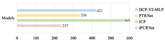 We describe the test times of different methods on a server with an Intel E5-2600 CPU, an Nvidia GeForce RTX 2080Ti GPU, and 64GB of memory. The calculation time is calculated in milliseconds, with an average of 100 point cloud pairs containing 1024 points. As Figure 4 shows, iPCRNet is the fastest method, with PTRNet second only to iPCRNet. The reason is that the model complexity of iPCRNet, PTRNet and DCP-V2-MLP is from low to high, respectively. Meanwhile, the ICP algorithm requires every point on the data point cloud to find the corresponding point by traversing every point on the model point cloud, so its registration speed is slow.