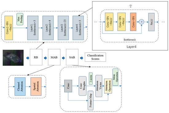 Network architecture of SAF. The residual learning block (RB) is pretrained to learn more context features. The mixed attention block (MAB) can extract salient category information via the simultaneous use of channel attention and spatial attention. The self-attention block (SAB) constructs a classifier with attention to improve performance.