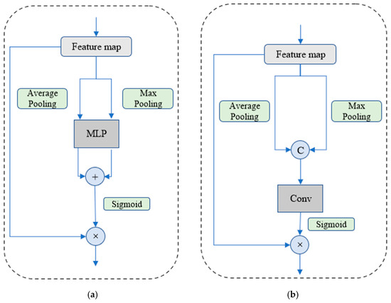 where MAB is the function of MAB, which is composed of the functions (C and S) of channel attention and spatial attention. The channel attention block [9] aims to find out which channels deserve attention, and its structure is shown in Figure 2a. It consists of a max-pooling operation, an average pooling operation, a multi-layer perceptron (MLP), and a sigmoid operation. Specifically, it firstly exerts average-pooling and max-pooling operations to create a map with the size 14 × 14 × 2048, and then a parameter-shared MLP aggregates the obtained feature vectors. More detailed information can be found in Equation (3), as follows: