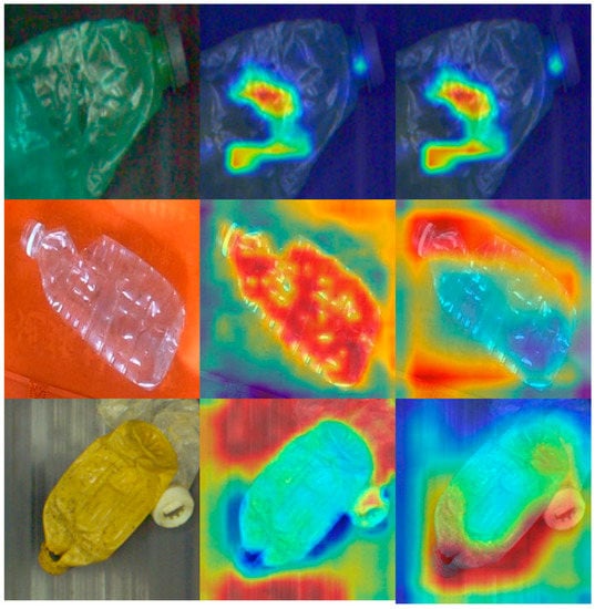 One bottle image (on the left) and its grad cam map of a waste bottle with the damaged classification on the last layer of RB (in the middle) and on the last layer of MAB (on the right). Our model can precisely locate the “damaged area” and the MAB makes it more focused (we mark relatively unimportant pixels for classification in blue and relatively important ones in red).