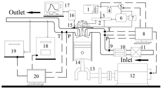 Schematic of experimental set-up: 1 fuel tank; 2 fuel rail; 3 pressure sensor; 4 fuel filter; 5 fuel consumption meter 6 high pressure pump; 7 electric motor; 8 PC and control unit; 9 air flow meter; 10 intercooler; 11 air filter; 12 dynamometer; 13 crankshaft; 14 piston; 15 cylinder pressure sensor; 16 charge amplifier; 17 combustion analyzer; 18 gas analyzer; 19 smoke meter; 20 PC and control unit.