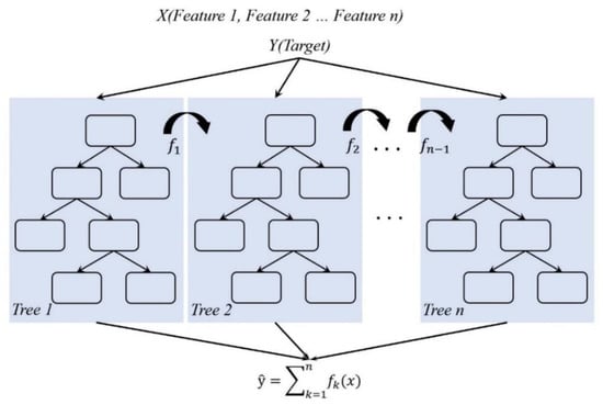 XGB (Extreme Gradient Boosting) trains multiple decision trees in series. Each decision tree learns from the previous decision tree and generates the final prediction result by synthesizing the decision values of all weak learners. XGB expands the loss function using a second-order Taylor series and introduces the regular term to avoid overfitting of the model [25]. Figure 2 is the schematic diagram of XGB model.