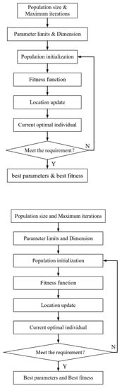 The predictive performance of the initialized model was poor and insufficient for the purpose of in-cylinder pressure prediction, so the hyper parameters of the model needed to be optimized. The upper and lower bounds of the hyper parameters needed to be set before the optimization of the prediction model using the SSA. The upper and lower bounds of the five hyper parameters were empirically set to (10, 1000, 0.3, 10, 0.3) and (1, 100, 0.01, 1, 0.01), respectively. The dimension of the hyper parameters which need to be optimized was five, and the number of sparrow populations was set to 100. The fitness value was the sum of the MSE of the training set and test set; the fitness function is shown in Equation (11):