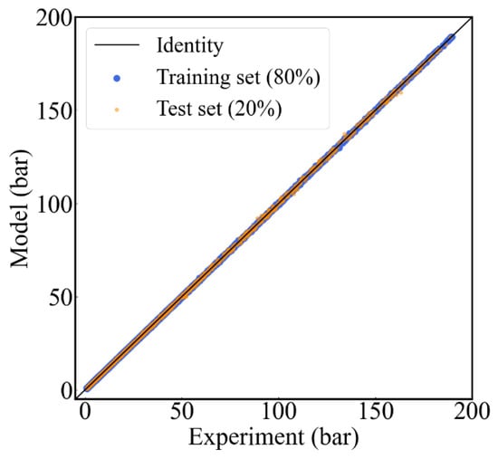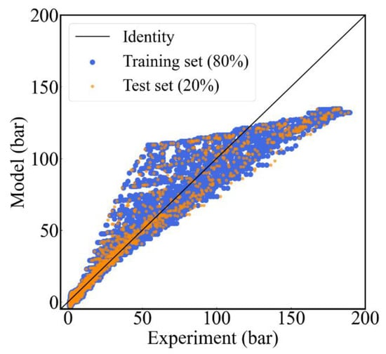 Figure 4 shows the results of the regression analysis of the initialized model, in which the blue scatter points represent the results of prediction for the training set, the orange scatter points represent the results of prediction for the test set, and the black straight line represents the 45° line where the predicted values are equal to the test values. The number of samples in the training set is 27,667 and the number of samples in the test set is 6917 according to the data set division ratio described in Section 2.3.2. It can be seen in Figure 4 that the prediction performance of the initialized model is poor, and the prediction results for samples with larger values are extremely inaccurate.