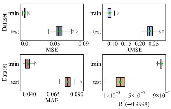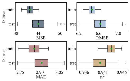 In order to comprehensively evaluate the performance of the initialized model, the data set was randomly divided in the ratio of 8:2, and a total of 100 training and testing processes were performed on the model, and then the evaluation results of each metric were calculated and recorded; the results are shown in Figure 5. The mean values of MSE, RMSE, MAE, and R2 of the initialized model are 44.02, 41.81; 6.63, 6.47; 2.91, 2.86; 0.940, 0.943 (test set, training set), respectively.