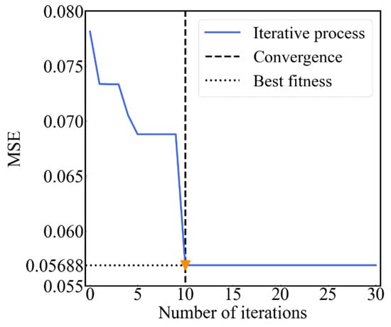 The optimization trajectory of SSA is shown in Figure 6. According to the optimization trajectory, it can be seen that the value of the optimal fitness of the population continued to decrease as the number of iterations increased, and the calculation converged when the number of iterations reached 10, which implies that the optimal value was found. The value of the minimal MSE was 0.05688, and the corresponding values of the five hyper parameters of the model were 8, 1000, 0.0688, 4.8015, and 0.01, respectively.