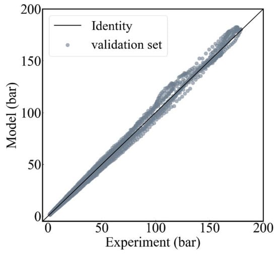 The validation set contains in-cylinder pressure data from six different operating conditions, of which there are 8646 samples. Using the optimized model to predict the validation set, the regression analysis is shown in Figure 9. As can be seen in Figure 9, most of the samples lie around the diagonal line, and only a few validation samples with larger values deviate, which means that the model obtained very accurate prediction results on the validation set.