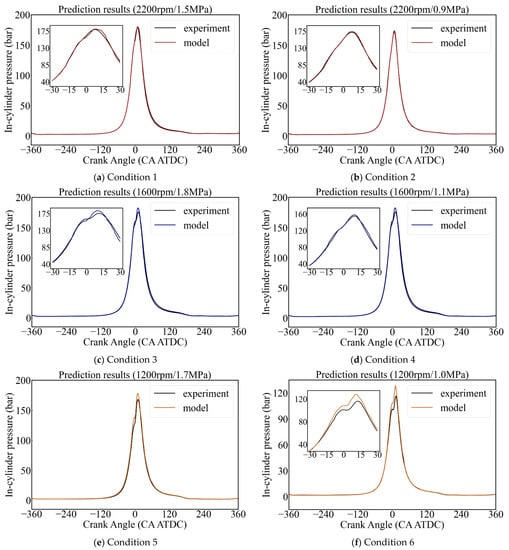 In order to represent the prediction results of the validation set more intuitively, the predicted values of each validation operating condition were fit to the actual values; the results are shown in Figure 10. The horizontal axis is the crank angle and the vertical axis is the in-cylinder pressure value. The black curve represents the actual value acquired in the tests, and the rest of the curves in different colors are the predicted values of the prediction model. As can be seen in Figure 10, the predicted values from operating condition 1, 2, and 4 are in good agreement with the actual values, and the predicted in-cylinder pressure values at the rest of the operating conditions only deviate from the actual values in the peak region.