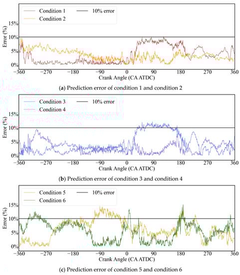 Figure 11 shows the results of the error analysis for the validation conditions. The horizontal axis of the figure is the crank angle, the vertical axis is the error value, the black horizontal line indicates 10% error line, and the colored dashes represent the specific error between the predicted and actual values for all samples in different validation operating conditions. From Figure 11a,b, it can be seen that the error between the predicted and actual values for all samples in the validation condition 1, 2, and 4 is less than 10%, and the prediction error in the range of 0~180° CA ATDC is relatively larger. There are more samples with prediction errors greater than 10% in condition 5 and 6. After counting, the percentage of samples with all prediction errors below 10% in the validation set is 94%.
