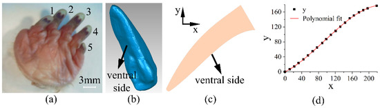 Mole rat’s paws. (a) Ventral side of the left front paw [26], (b) 3D model, (c) the perpendicular bisector plane, and (d) the extracted coordinates and its fitting curve of the No. 4 digit of mole rat’s claw.
