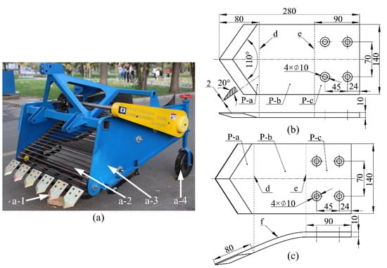 Photo of 4U-110 potato harvester (a) and detail drawing of DZ ((b), dimensions in mm) and YS ((c), dimensions in mm). (a-1) Potato digging shovel, (a-2) conveying and separating device, (a-3) harvester’s frame and (a-4) ground wheel.