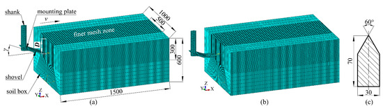 The soil box in the FE model for the interaction between soil and a single shovel is a cuboid with a dimension of 1500 mm × 1000 mm × 600 mm (length × width × height), as shown in Figure 3a,b. The dimension of the shank’ cross section is shown in Figure 3c. To balance the accuracy and calculation time in FE simulations, a finer mesh with an element size of 10 mm is used for the domain in the middle of the top layer, while the element size for the remainder in the soil box is 50 mm, as shown in Figure 3a,b. The bottom left-side wall and right-side wall in the soil box are totally fixed, while other surfaces are not constrained. Meanwhile, the potato digging shovels are controlled to move only along the X direction with different speeds. In order to reach the needed speed gradually to avoid the divergence in calculations, the speed is multiplied by an amplitude function. The contact between shovel’s rigid surfaces and soil nodes is defined as a surface-to-surface contact using a penalty function method, and the rigid surfaces are selected as master surfaces and the deformable soil nodes in the finer mesh domain as slave surfaces. The normal behavior between contacted surfaces is defined as hard contact, while the tangential behavior is defined as the penalty friction formulation with a friction coefficient of 0.42.