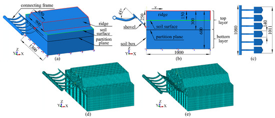 Figure 4 shows the FE models for the interactions between soil and grouped shovels, which are employed to predict the field working performance of shovels. According to the requirements of ridge planting for potatoes in Gansu province, a ridge (red line in Figure 4a,b) is added on the soil surface (green line in Figure 4a,b). The top width, bottom width and height of the ridge are 650 mm, 900 mm and 150 mm, respectively. Thus, the soil box in the FE models for the interactions between the soil and grouped shovels is a cuboid (length × width × height = 1000 mm × 1300 mm × 450 mm) with a ridge on its top, as shown in Figure 4a,b. Similarly, the whole soil box is partitioned into two layers by a partition plane (black line in Figure 4a,b), and a finer mesh with an element size of 10 mm is used for the top layer, while the element size for the bottom layer is 50 mm. Moreover, the interaction parameters used in the FE models for the interactions between soil and grouped shovels are kept identical with those of the FE models for the interactions between soil and a single shovel. The bottom of the soil box is totally fixed, while other surfaces are not constrained. In addition, the potato digging shovels are also set to move only along X direction. Figure 4d,e show the finite element mesh of the soil box being cut with grouped DZ and YS, respectively.