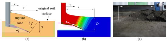 The horizontal force parallel to the cutting direction is the key component of the draught force [35]; thus, the force parallel to the X direction is regarded as the draught force in this paper. As shown in Figure 5, after being compacted and cut by shovels, the displaced soil is moved forward, sideward and upward, and finally a crescent soil failure zone is formed in front of the shovels. The soil rupture distance or soil rupture distance ratio (defined as the ratio of the rupture distance r to the working depth D) is always selected to characterize the feature of this zone [36,37,38]. Thus, the draught force (FD) under the steady state is selected as the primary indicator, and the soil rupture distance ratio (f) as the secondary indicator to evaluate the performance of potato digging shovels in this study. Here, the soil rupture distance is measured by the border between the rupture zone and non-disturbance zone in the displacement contour plot (as shown in Figure 5b). Figure 5c shows the soil rupture observed in soil bin experiments.