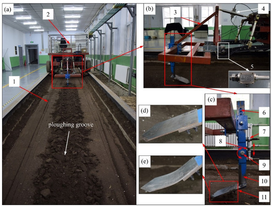 Soil bin experiments for a single potato digging shovel. (a) Soil bin experiments system, (b) test system, (c) connecting shank, (d) DZ, (e) YS, (1) soil bin, (2) tractor, (3) mounting frame, (4) upper pull rod sensor, (5) lower suspension pin sensor, (6) upper shank, (7) joint bearing, (8) double-end stud, (9) rotating shaft, (10) lower shank and (11) potato digging shovel.