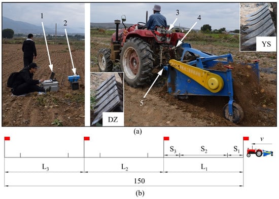 Testing system used in field draught force tests (a): (1) laptop, (2) signal receiver, (3) signal acquisition and transmission device, (4) upper pull rod sensor and (5) lower suspension pin sensor. Sampling area partition for field draught force experiments (b): L1, L2 and L3 represent the experimental travelling distance, S1 represents the preparation area, S2 represents the sampling area and S3 represents the finishing area.