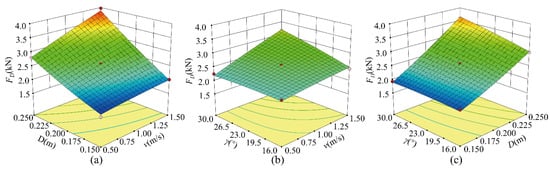 Response surfaces of the simulated draught force FD for DZ under the influence of different factors. (a) v and D, γ = 23°; (b) v and γ, D = 0.20 m; (c) D and γ, v = 1 m/s.