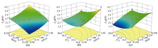 This regression equation is highly significant at p < 0.0001, and the value of its R2 is 0.9942. The statistical analysis for DZ demonstrates the keen sensitivity of FD to all factors (i.e., cutting speed v, digging depth D and mounting angle γ (see Figure 3a)), which can also be supported by Figure 9a–c in which the increases in these three factors all result in the increase in the draught force. The need to accelerate more soil mass and overcome increased friction is the major reason for increasing the draught force caused by the increase in cutting speed and digging depth [41]. The higher the γ, the larger the projected area facing soil mass, and thus, the draught force increases, which was reported by McKyes and Ali [36], Tamas et al. [42] and Barr et al. [43]. Moreover, Figure 9 shows that the response surfaces evolve sharply along the change both in D and v, but it turns tame along the change in γ, which can also be concluded based on their F values in Table 5, and thus the contributions of the factors to the draught force follow the order D > v > γ. Additionally, the p values of the sources indicate that the effects of v, D, γ, vD, vγ and Dγ are highly significant, while the effects of the other sources (i.e., v2, D2 and γ2) are not.