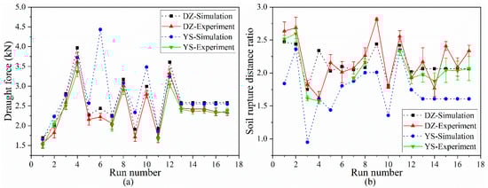 Comparisons of the simulated results with the experimental results for the draught force (a) and soil rupture distance ratio (b).