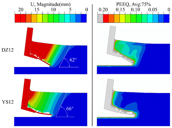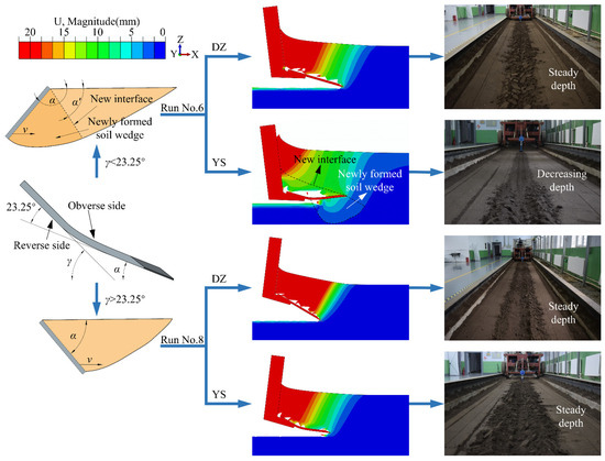 Soil failure can be defined as the permanent deformation of the soil, and thus, plastic strain can be used to evaluate the soil failure [31]. It can be concluded from Figure 13 that the great equivalent plastic strain is obvious both around the tip of shovels and in front of the shank, but the great equivalent plastic strain area of DZ is evidently larger than that of YS. Furthermore, the soil rupture angle of YS (66°) is 4° lower than that of DZ (62°). All of the evidence means that the soil influenced by YS is more likely to move upward. Obviously, the resistance in the upward direction is much lower than the reaction force from undisturbed soil in the forward direction.