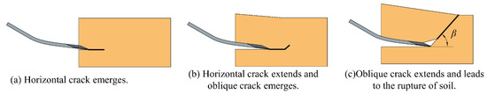 As is shown in Figure 14, the soil failure evolution under the influence of potato digging shovels (PDS) is a continuous cycle and can be summarized as follows: (1) Firstly, after the P-a of PDS sticks into and cuts soil, elastic deformation occurs and then evolves into plastic deformation [47], which spurs the emergence of horizontal cracks (Figure 14a). (2) Next, as PDS keeps moving forward, the horizontal crack extends, the soil mass is compressed and lifted upward and backward, and then an oblique crack emerges (Figure 14b). Here, the compaction to soil accounts mainly for the increase in the draught force [48]. (3) Finally, as a critical intensity of the combination of the normal and shear stresses is reached, the oblique crack extends to the soil surface and a failure plane is formed [48,49], which leads to the rupture of soil mass and its separation with undisturbed soil (Figure 14c). Subsequently, the draught force decreases and the above process repeats, and thus the signal fluctuates.