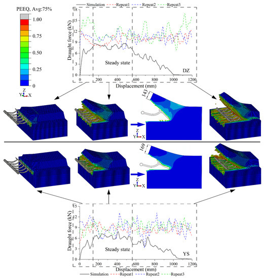 Figure 15 demonstrates the simulated and field measured draught force as well as the soil failure properties of grouped shovels. It is very clear that the draught forces for both DZ and YS begin to stabilize at a displacement of about 140 mm but decrease to 0 gradually at a displacement of about 560 mm. Meanwhile, the signals of the draught force are fluctuating constantly, which corroborate the reports by Kasisira and du Plessis [48], Wang et al. [47] and Kobayakawa et al. [50].