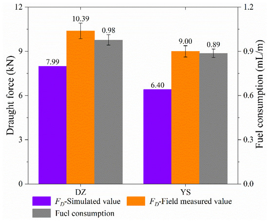 As shown in Figure 16, the simulated and field measured draught forces of the grouped YS are 6.40 kN and 9.00 kN, respectively, while those of the grouped DZ are 7.99 kN and 10.39 kN, respectively. It is noticeable that the draught force of YS in simulations and field experiments are 19.85% and 13.33% lower than those of DZ, respectively. In addition, the fuel consumption of YS is 9.18% lower than that of DZ, which further verifies the simulated and field measured draught forces for the grouped shovels. Therefore, YS exhibits significant performance in energy consumption reduction.