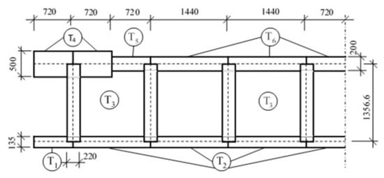 The computational model of the structure was created from slab-wall elements. A quadrilateral, eight-node, Mindlin element was used to create the computational model []. The element has nodes in the corners of the rectangle and the centers of the sides. The center node has displacement vector component {u} = [u,v,w]T as the unknown, and the corner nodes have displacement vector component {u} = [u,v,w]T and rotation vector component {φ} = [φ(x), φ(y), φ(z)]T as unknowns. The whole structure was assembled from six types of elements. The total number of elements is 812. The cross-sectional dimensions of the model are shown in Figure 2. The number of degrees of freedom of the model is 8259. The dimensions of the individual types of elements and their mass characteristics are in Table 1. Material characteristics: modulus of elasticity E = 3.85 × 1010 N/m2, Poisson’s ratio υ = 0.15.