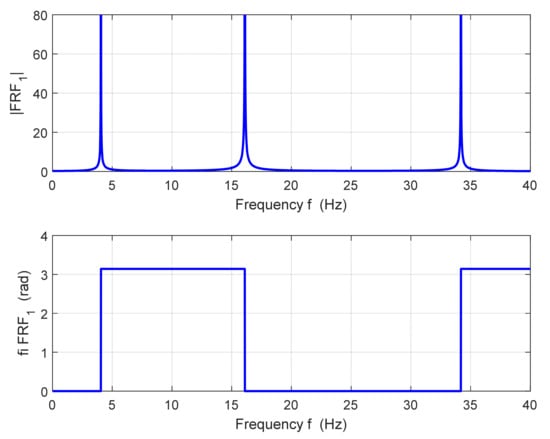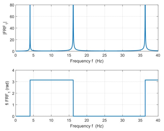 By solving the system of Equation (35) in the frequency band 0 ÷ 40 Hz, the amplitude and phase characteristics are calculated. A frequency step of 0.01 Hz was used for the calculation. The absolute value (magnitude) of the frequency response function at point 1 (|FRF1|≡ ||) and its phase (fi FRF1 ≡ φ1) are plotted in Figure 8. FRF is a complex function. In our particular case, the functions (i = 1, 2, 3) are real functions. That is all right, because an undamped system can only vibrate in phase or in antiphase, φi = 0 or π (i = 1, 2, 3). The vector (i = 1,2,3), therefore, has only a real component, which represents the special case of a complex number.