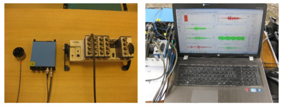 The following experiment was performed to verify the values of some of the calculated natural frequencies. The response of the bridge to the technical seismicity caused by railway traffic under the bridge was monitored. KB12VD 15,040 accelerometers from Metra Mess and Frequenztechnik (MMF) were used to measure the response. This is a classic accelerometer that uses a piezoelectric effect. The sensors operate in the frequency range from 0.15 to 260 Hz. The signal from the sensor is amplified by the charge amplifier M68, also a product of MMF. The amplifier also serves as an integrating member and a low-pass filter. The signal is further digitized in an analog-to-digital converter (A/D converter National Instruments NI 9215) and enters the computer in numerical form, where it is stored and further processed. The complete set of instruments, including the computer, is shown in Figure 11.