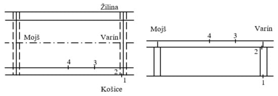 The localization of the sensors on the second bridge field is shown in Figure 12 (top view on the left, side view on the right). Sensor 2 was placed above the support, sensor 3 at 1/4 of the span, and sensor 4 at 1/2 of the span. A total of eight measurements were carried out. The vibrations of the bridge were registered during the passage of eight trains under the first field of the bridge. Spectral analysis (Power Spectral Densities—PSD) was performed from the monitored records using the DISYS system []. Discrete Fourier Transform (DFT) was used to calculate the PSD. The length of the records ranged from about 60 to 200 s which, at a sampling frequency of 1000 Hz, represents 60,000–200,000 samples. The algorithm works with the number of 2n samples. The power of n was in an interval from 16 to 18. The detected values of frequencies with a dominant position (interval and average value) are given in Table 3. The experiment was realized in April 2016.